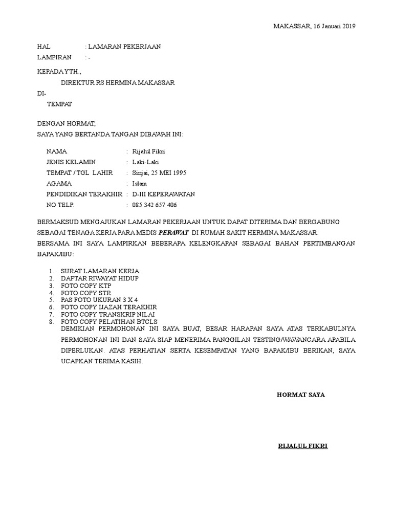 9 Contoh Surat Lamaran Kerja di Rumah Sakit Berbagai Posisi from idmanajemen.com Bagi yang ingin melamar pekerjaan sebagai perawat di rumah sakit siloam atau di rumah sakit lain, silakan gunakan template ini. Bermaksud untuk mengajukan lamaran pekerjaan di ruman sakit siloam hospital tb simatupang sebagai staff pendaftaran. Surat lamaran kerja juga penting bagi kamu yang masih kuliah namun ingin magang di sebuah perusahaan untuk mendapat pengalaman. Contoh surat lamaran kerja yang baik dan benar untuk dijadikan referensi dalam usaha mencari kerja di sebuah perusahaan sesuai dengan keahlian kamu. Jika diminta surat lamaran kerja dalam bentuk tulis tangan saat melamar pekerjaan di rumah sakit, contoh ini bisa menjadi rujukan anda. Contoh surat lamaran kerja yang baik dan benar kedua diatas, sangat berguna buat yang ingin melamar pekerjaan ke perusahaan perusahaan yang besar dan kompetitif, contoh bank mandiri dan bni yang mencari karyawan di bidang bidang yang profesional. Documents similar to contoh surat lamaran kerja di rumah sakit. Sebelum ke pembahasan utama mengenai contoh surat lamaran kerja , sebaiknya kita ketahui terlebih dahulu format, cara, dan tips dalam berikut adalah beberapa contoh surat lamaran kerja yang ditunjukkan untuk beberapa perusahaan, seperti pt, bank, indomart, dan lain sebagainya.